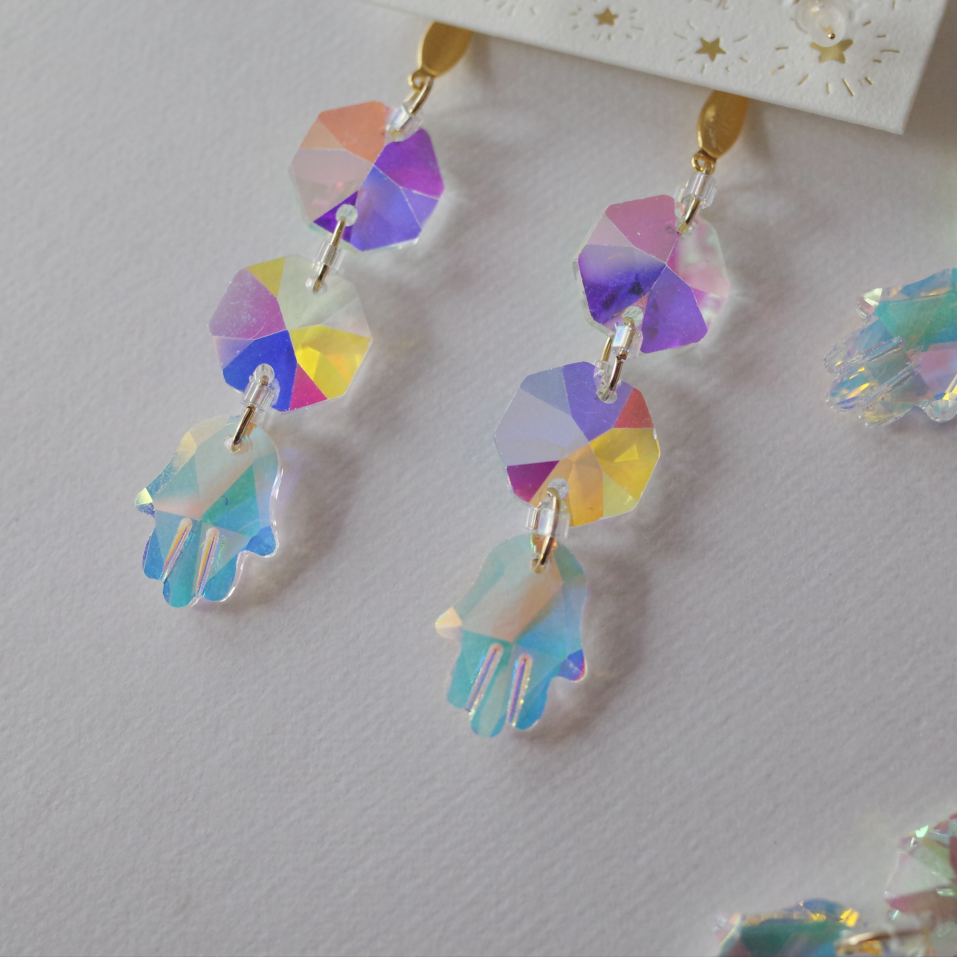 クリスタルガラスとハムサの手を繋げた耳飾り